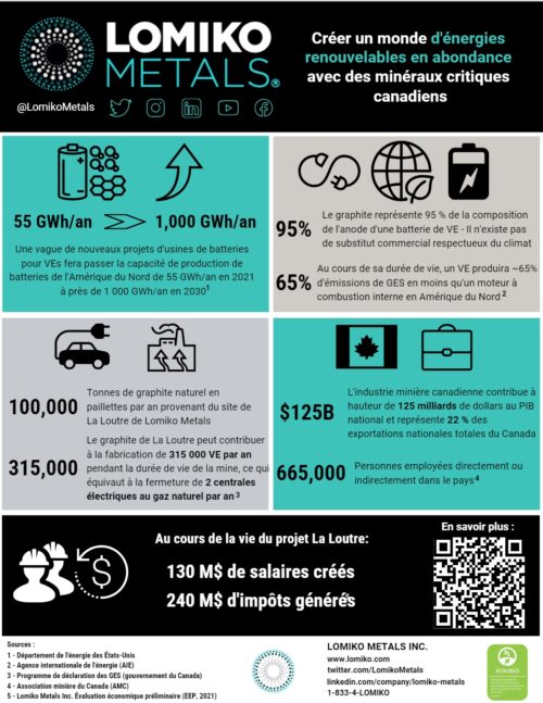 Enfin, Lomiko Metals souhaite exprimer sa confiance envers la rigueur des processus gouvernementaux d’approbation et d’autorisation propres à ce type de projet. Nous sommes convaincus que le projet La Loutre saura satisfaire à toutes les exigences du Bureau d’audiences publiques sur l’environnement (BAPE) et pourra aller de l’avant. Faisant partie de la Stratégie canadienne sur les minéraux critiques, qui identifie le graphite comme l’un des six minéraux critiques prioritaires, ainsi que du Plan québécois pour la valorisation des minéraux critiques et stratégiques, nous nous engageons à réaliser un projet exemplaire qui contribuera à la réussite de ces politiques essentielles pour la transition et la sécurité énergétique.